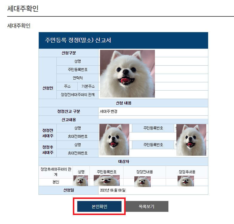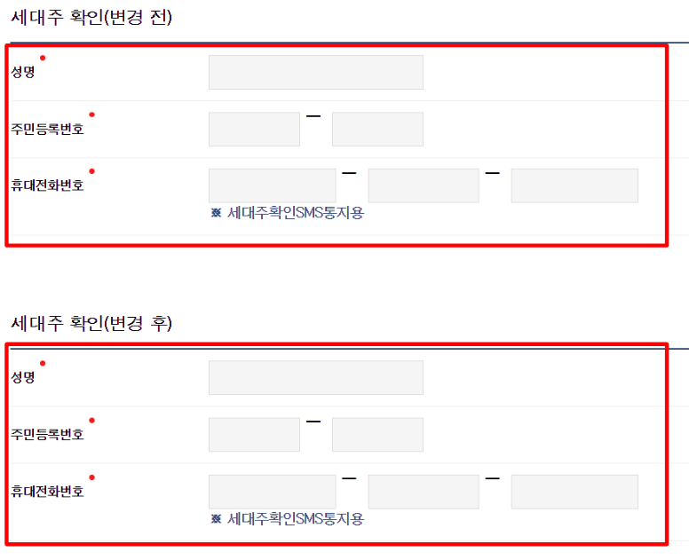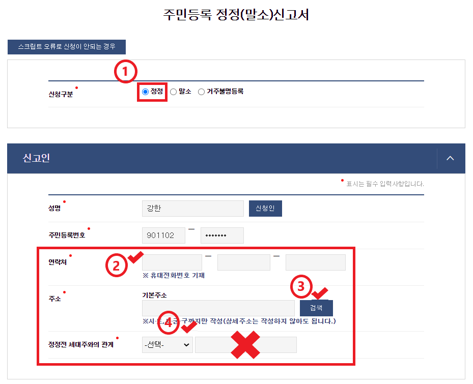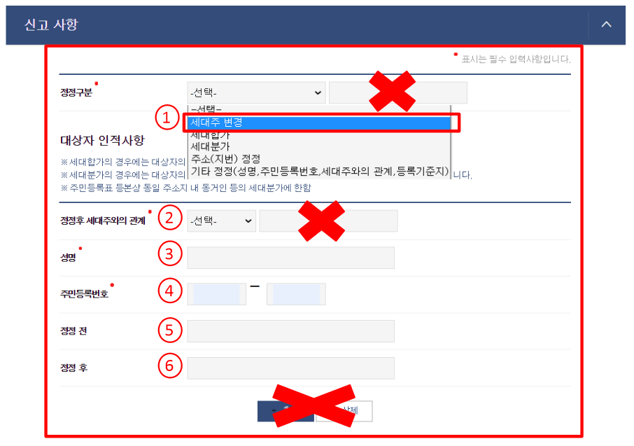 ① 전 세대주의 성명, 주민등록번호를 적어주자.
