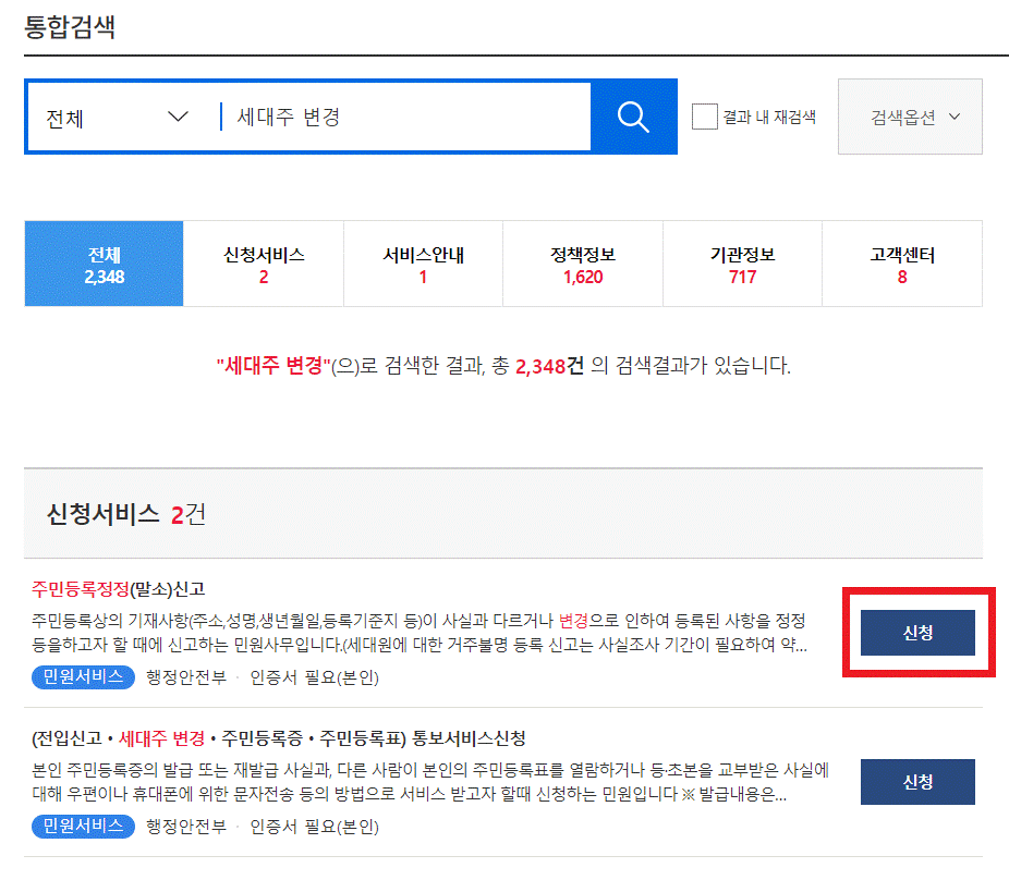 그리고 정부24 검색란에 '세대주 변경' 또는