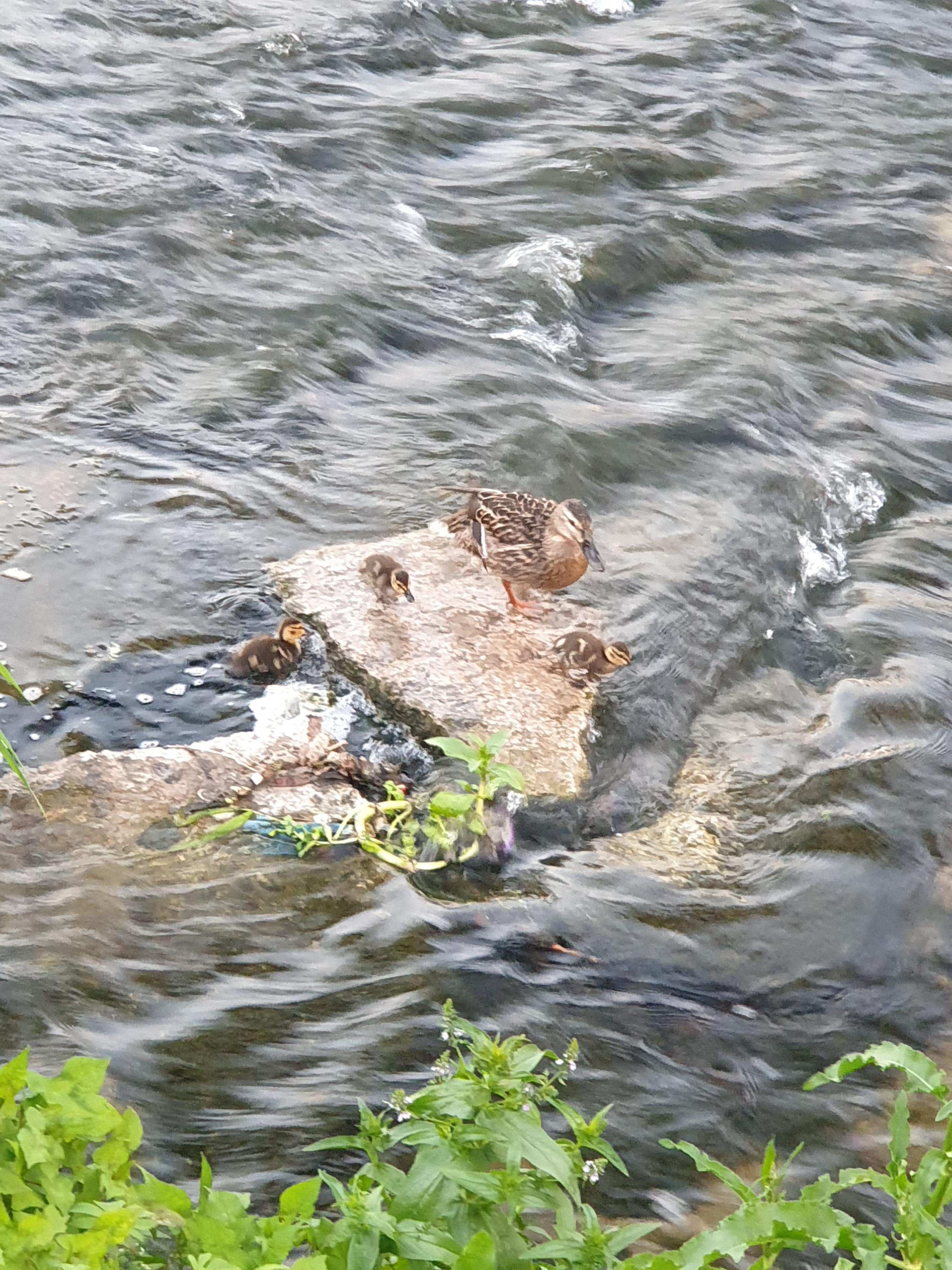 물이 맑은 것을 엄마오리와 애기오리들이 증명하고 있다. 아기오리들과 헤엄쳐도 안전한 맑은 물이 되겠다.