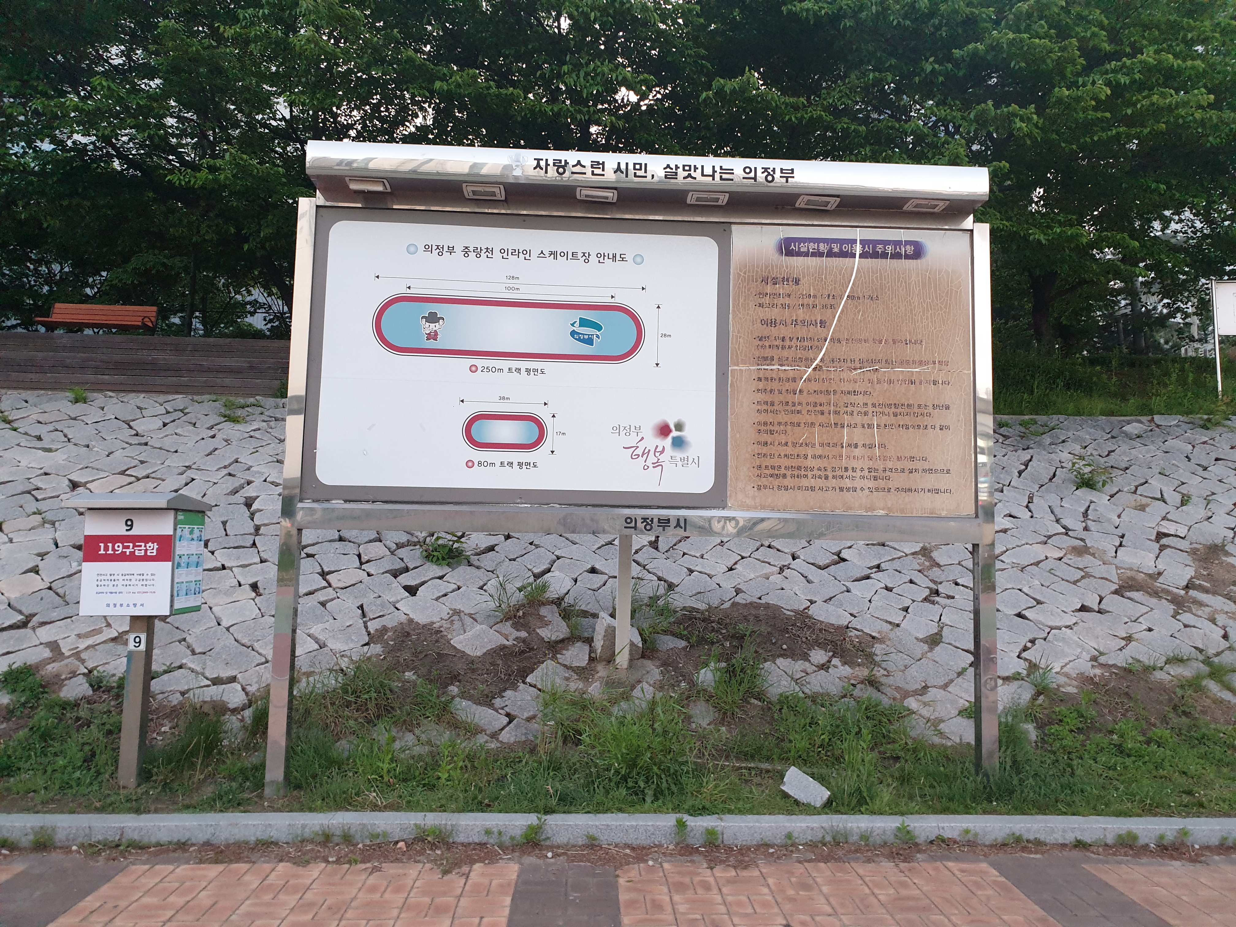 스케이트장 옆에는 119 구급함이 있고 '자랑스런 시민, 살맛나는 의정부'라고 써진 안내문에 또 한번 의정부 시민이라는것에 가슴이 웅장해진다. 이 인라인 스케이트장에서는 굳이 인라인이 아니더라도 요즘 10~20대가 많이 타는 롱보드 같은 것을 타도 좋을 것 같다고 생각이 들었다.